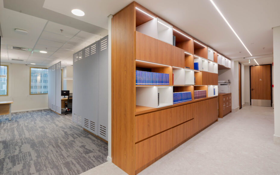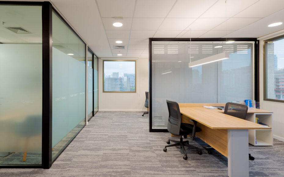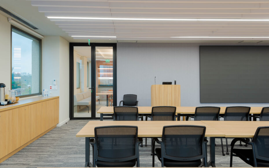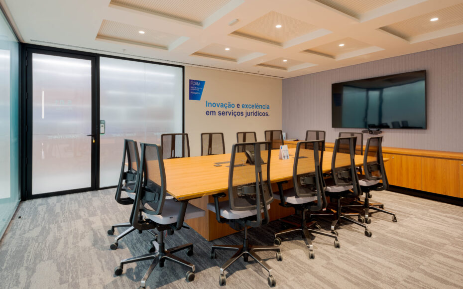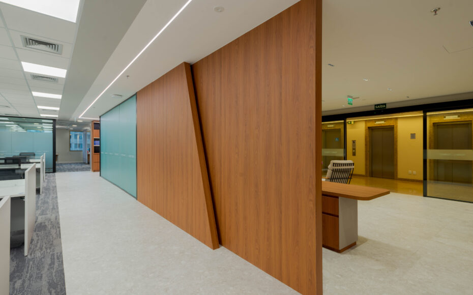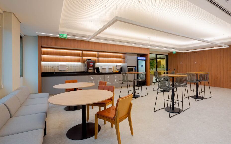 Nos ambientes de trabalho, transparência e integração orientam o layout. As salas de reunião seguem a mesma identidade espacial, oferecendo conforto acústico e uma atmosfera serena que favorece tomadas de decisão.