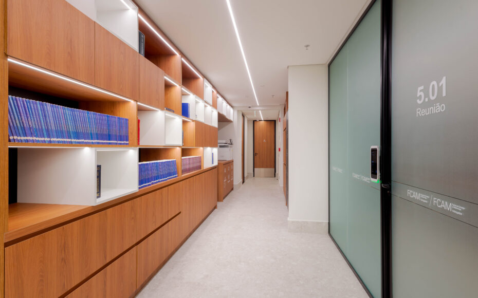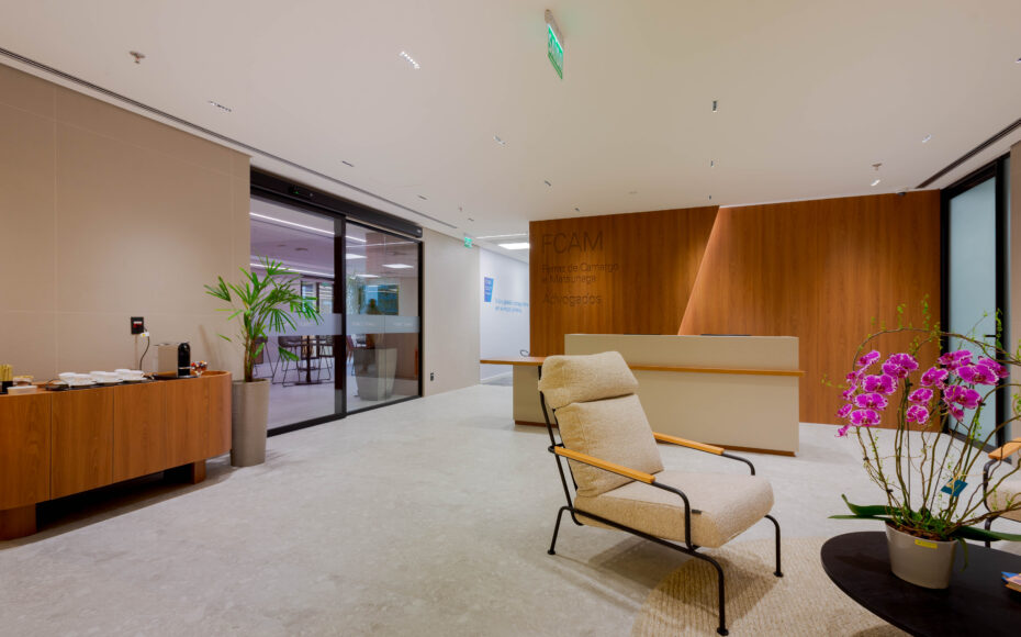 Na recepção, o painel em madeira natural e o mobiliário de linhas puras compõem uma chegada imponente, porém acolhedora. Funciona como um cartão de visitas que comunica imediatamente os valores da FCAM.