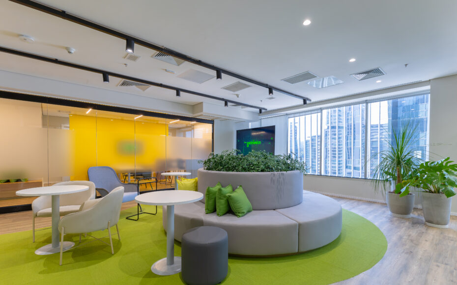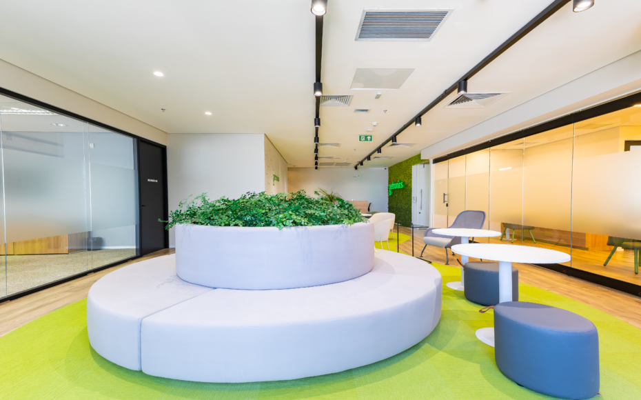Elementos naturais, como paredes verdes e materiais sustentáveis, foram incorporados para intensificar a relação com a natureza, promovendo um ambiente de trabalho mais saudável e inspirador. O layout foi cuidadosamente planejado, integrando áreas de convivência e espaços colaborativos, que incentivam a troca de ideias e a inovação, ao mesmo tempo em que respeitam a ergonomia e o conforto dos colaboradores.