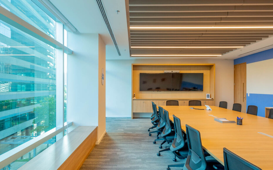 Logo na entrada, um grande lounge multifuncional atua como ponto de encontro para eventos, reuniões estratégicas e recepção, reforçando o papel do espaço como elemento ativo na experiência corporativa. A fluidez do layout conecta a sala do conselho, áreas de diretoria, café e setores colaborativos à operação do dia a dia, promovendo integração real entre liderança e times.
